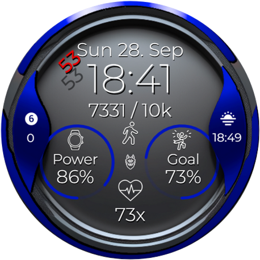 Futuristic watch face with smart functions in metallic blue.
